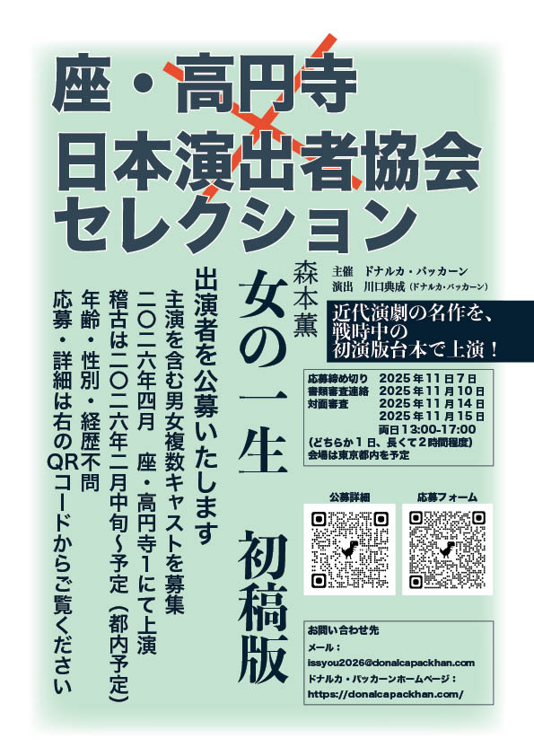 ドナルカ・パッカーンは2026年4月に座・高円寺1にて、日本演出者協会セレクションの一環として、森本薫「女の一生」初稿版を完全上演いたします。本公演の出演者を主人公の布引けい役を含めて公募いたします。