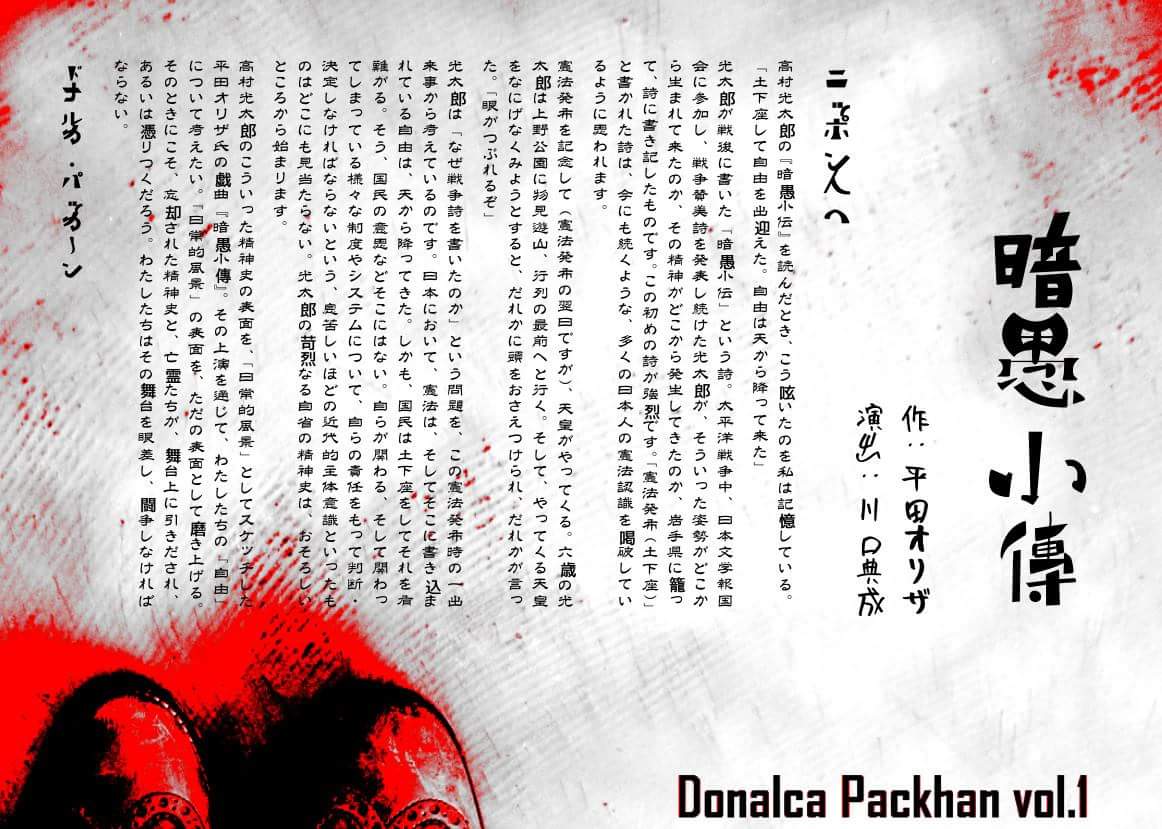高村光太郎のこういった精神史の表面を、「日常的風景」としてスケッチした平田オリザ氏の戯曲『暗愚小傳』。その上演を通じて、わたしたちの「自由」について考えたい。「日常的風景」の表面を、ただの表面として磨き上げる。そのときにこそ、忘却された精神史と、亡霊たちが、舞台上に引きだされ、あるいは憑りつくだろう。わたしたちはその舞台を眼差し、闘争しなければならない。
