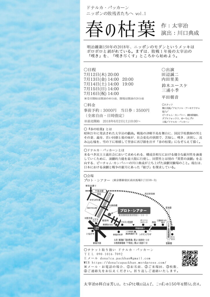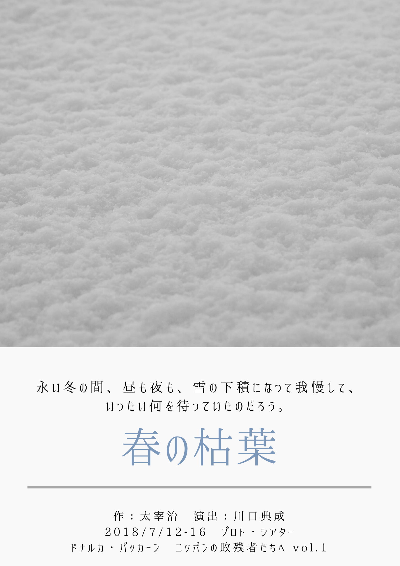昭和21年に発表された太宰治の戯曲。 戦後の津軽半島を舞台に、国民学校教師である野中彌⼀とその妻、義母、若い同僚と彼の妹らが、 当時の社会情勢や地元の因習などの重圧に苦悩し、嘆き、そして決別し、あるいは沈み込む様を、 雪の下に堆積して翌春に再び顔を出す「春の枯葉」になぞらえて描く。